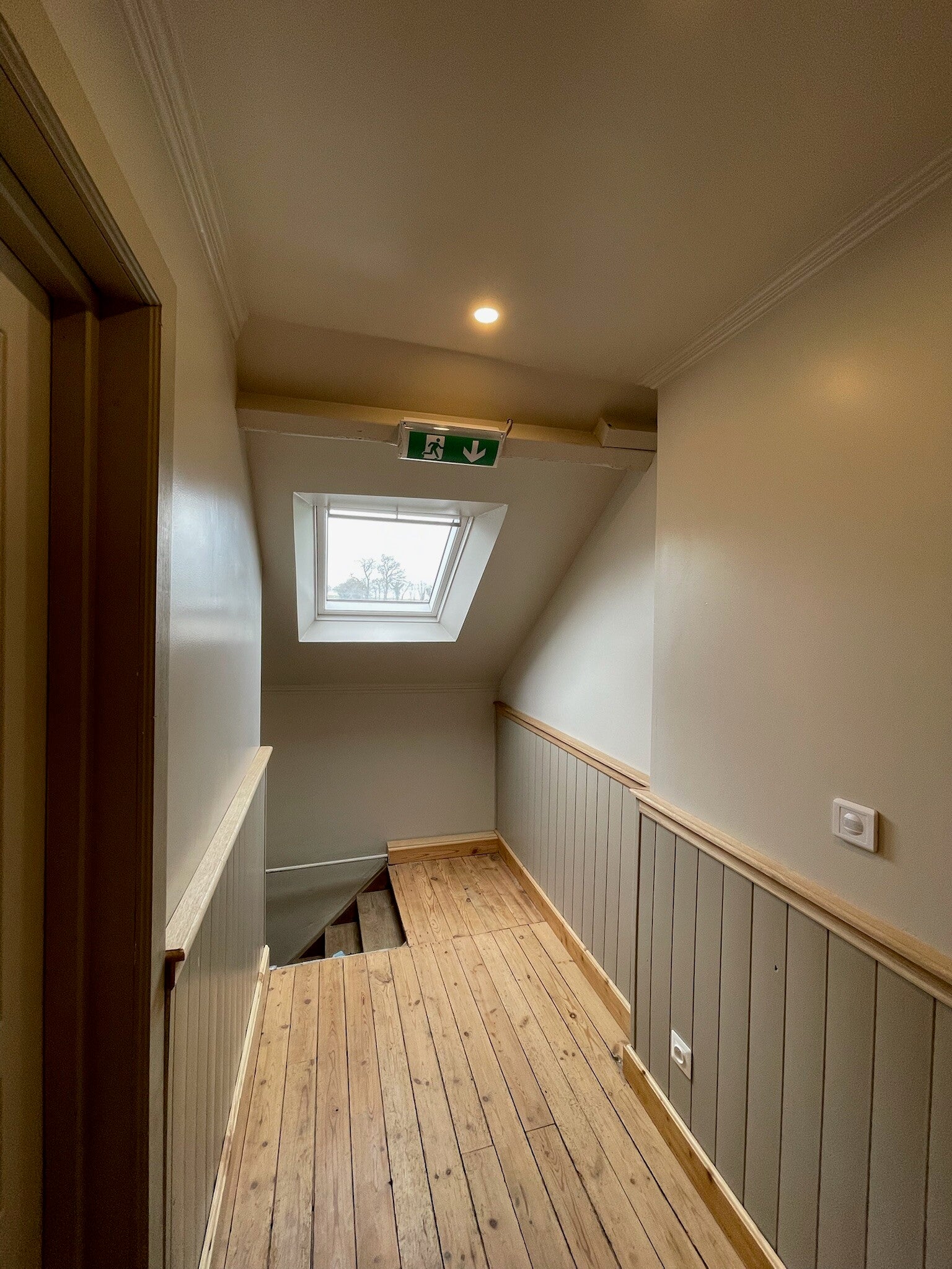 Er zijn 2 ruime veluxramen waarvan 1 openzwaaiend is met zicht over het domein en de velden. In de verte kan u, bij helder weer, zelfs de kerktoren van ons dorp zien.